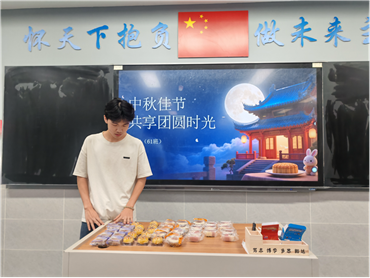 班会伊始,高二61班班长韩旭哲凭借提前准备好的PPT,以“团圆”为核心开启主持。他先是清晰梳理了中秋节的起源与发展,从先秦“祭月”习俗讲到现代“家人团聚、赏月品饼”的传统,又结合自己儿时与爷爷奶奶一起做月饼、挂灯笼的经历,生动讲述了中秋团圆的温馨故事。教室里满是对节日的期待与对团圆的向往。