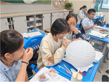 而在灯笼创作组,几位同学围坐在一起,有的手持画笔在白色纸灯笼上绘制桂花枝桠,有的细心调整灯笼骨架的角度。过程中,遇到裁剪困难的同学会主动请教小组里的“手工达人”,负责搭建骨架的同学也会互相帮忙调整角度,原本略显陌生的新同学,在协作中慢慢熟悉起来。