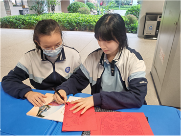 班会最后一个环节是手工创作,同学们以大组为单位,分工合作制作灯笼和窗花。在窗花制作区,两位同学正专注地在红色剪纸上勾勒图案,笔锋流转间,玉兔、月亮的轮廓逐渐清晰;旁边的同学已经完成裁剪,将印有中秋元素的窗花小心翼翼地展开,每一处细节都透着对节日的用心。