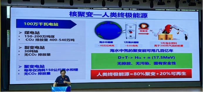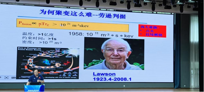 李建刚院士致敬了我国磁约束核聚变研究的奠基人、中国科学院院士李正武先生。李正武院士当年“中国要做聚变”的坚定信念,开启了我国在此领域的逐梦之旅。 随后,李院士将话题引向位于合肥科学岛的全超导托卡马克核聚变实验装置(EAST),又称“人造太阳”。他风趣地表示,实现可控核聚变“难于上青天”。他也介绍了国际热核聚变实验堆(ITER)计划,中国经过不断发展自我和争取加入,虽为后来者,但贡献巨大。院士借此阐述了科学合作超越国界的崇高精神。谈到如何成为科研事业的一员,李院士对同学们提出四点期望: