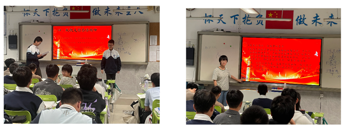随后的讨论环节将班会氛围推向高潮。“作为新时代的高二学生,我们该如何践行‘强国高我’的誓言?” 面对这一问题,同学们纷纷踊跃发言。张郅远同学表示,要努力学习科学文化知识,提升自身综合素质,为未来建设祖国奠定坚实基础;王诗洋同学表示只有讲好中国故事,走好中国道路,才能拥有一个光明未来。