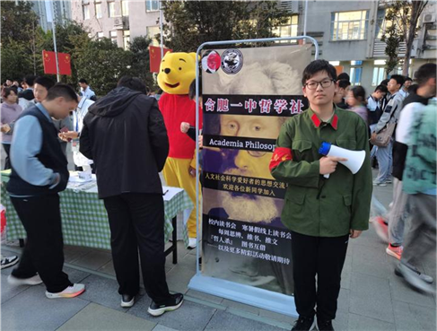 哲学社社长仇自强同学,身着革命时期复古服装精彩亮相。范逸航同学穿着卡通服装,充分调动了高一新生参与活动的积极性。作为合肥一中社团中富有影响力的社团,合肥一中哲学社也得到了很多兴趣爱好者的关注,诸多新生都围聚在哲学社摊位旁边,有的翻阅着哲学类书籍,有的认真听闻社长等社团管理层耐心地介绍社团,热闹非凡。