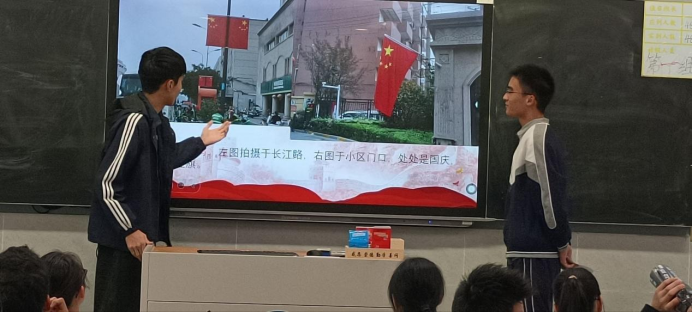 在“我家门口的‘中国红’”任务中,学生化身“文化观察者”,以镜头为笔、文字为墨,记录身边的国庆元素:街道上猎猎飘扬的五星红旗、商场内“我和国旗同框”的创意打卡装置、甚至电视里天安门广场升旗仪式的直播画面等。这一刻,‘国家’从课本概念转化为具体的情感联结。庆典符号不仅是视觉符号,更是集体记忆的载体,它们通过重复与参与,强化了‘我们’的共同体意识。通过此类实践,学生深刻体会到国家符号如何凝聚社会共识,激发爱国情感。