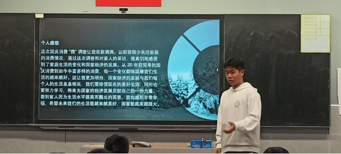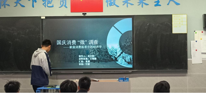 在“国庆消费‘微’调查”任务中,学生化身“家庭经济分析师”,记录在国庆节假期期间餐饮、旅游、购物等消费数据,并通过访谈对比父母年轻时的消费差异。从消费升级视角分析家庭生活水平变化,感悟国家经济发展对日常生活的深层影响。在分享中,学生更是在访谈父母后感悟到,20年前,国庆是“休息日”,现在,它成了“体验日”。消费内容从“吃饱穿暖”转向“品质享受”,背后是居民收入倍增、交通网络升级和文旅产业的蓬勃发展。这一变化折射出国家从“解决温饱”到“追求美好生活”的经济转型,也让学生理解了“发展成果由人民共享”的深刻内涵。