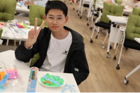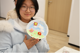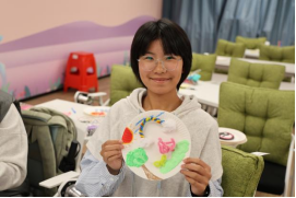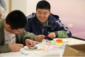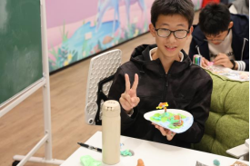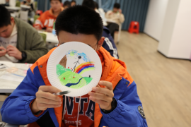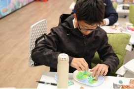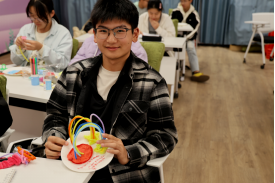 在经历了外在的探索与能量收集后,活动的第二篇章引导同学们将目光回归内心。在“感恩心球”创作活动中,同学们以蛋糕盒为圆形画布,借助水彩笔、黏土等材料,将抽象的自我关爱化为具象的艺术表达。