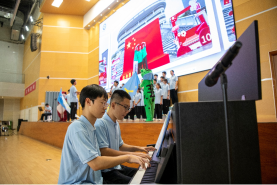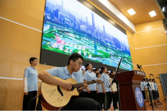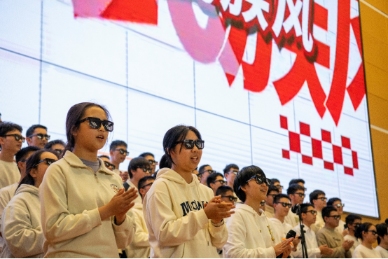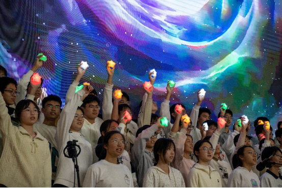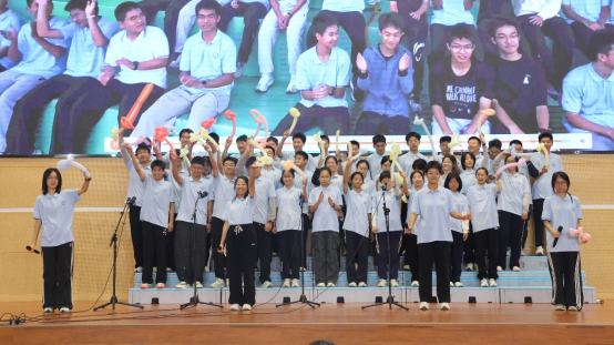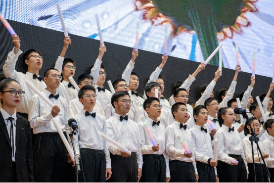 本届校歌节覆盖瑶海校区高一年级全部25个班级、1200名同学。每个班级需完成校歌与主选曲目的演绎。校歌演唱环节中,学子们肃然而立,歌声嘹亮,气势恢宏。“怀天下抱负,做未来主人”的校训精神在铿锵的旋律中激荡。自选曲目环节中,大家各展风采。从经典红歌到流行金曲,从深情合唱到创意朗诵,青春的活力与无限的创意在舞台上迸发。41班共唱《逐空》,展现学子们向内求索、突破边界的勇气;42班带着雷霆万钧的气势,以青春热血高唱《强军战歌》;59班以一曲《紫荆花盛开》,唱出了校园生活的绚烂多彩……每一首自选曲目,都是班级精神风貌的独特剪影,是集体凝聚力与创造力的生动体现,这些汇聚成合一岁月里一曲优美的青春和弦。