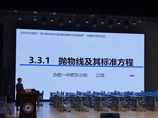 教学展示环节精彩纷呈,三位教师分别以不同形式呈现了对探究式教学的深刻理解。首先,合肥一中肥东分校的江雨老师带来“抛物线及其标准方程”无生授课。课堂上,江老师创新融合AI技术与教学内容,通过虚拟情境创设、动态图形演示等方式,将抽象的数学概念直观化、具象化,引导学生自主探究抛物线的定义与标准方程推导过程,充分展现了扎实的教学功底与前沿的教学理念。