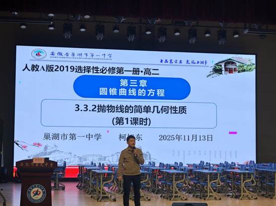 随后,巢湖市第一中学的柯旭东老师以“抛物线的简单几何性质”为题进行说课。江老师深耕教材内涵,紧扣学生认知规律与学习诉求,从教学目标设定、教学重难点突破、探究活动设计、学情预设与应对等方面展开详细阐述,逻辑清晰、重点突出,彰显了深厚的专业素养与对教学内容的精准把握。