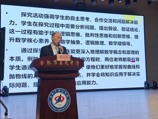 活动伊始,合肥市第九中学校长张永剑发表致辞。他指出,新课改对高中数学教学提出了更高要求,探究式教学不仅是落实核心素养的关键载体,更是激发学生数学思维、提升自主学习能力的重要途径。张永剑校长分享了合肥九中在探究式教学中的实践探索与思考,并对到场的各位教育同仁表示热烈欢迎与衷心感谢,期待通过本次研讨凝聚共识、碰撞智慧,共同推动高中数学教学质量的提升。