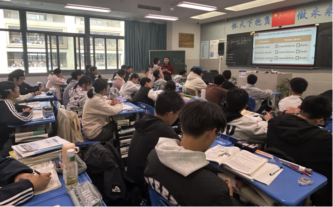 在听后输出环节,学生分组进行对话与演讲展示:有的模拟毕业派对中的祝贺场景,有的围绕“合肥一中毕业典礼”展开即兴演讲。现场互动积极,学生在真实语用中深化了对所学内容的理解。课程完整实现了从语言输入、内化到输出的学习闭环。
