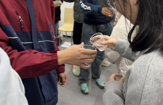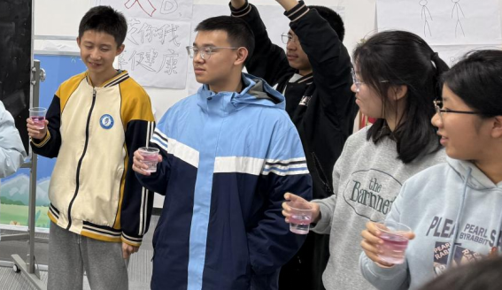 “碰杯游戏”通过互相倾倒溶液模拟社交行为,利用化学试剂模拟艾滋病毒的“传播”,生动呈现了艾滋病传播的隐蔽性与偶然性。同学们手持装有清水的杯子,仅有四分之一数量的杯内被提前滴入氢氧化钠溶液,在随机倾倒溶液后,通过酚酞试剂检验,所有同学的杯子都显现出红色——即被“感染”。同学们纷纷抒发自己的感慨,现场一片惊叹。刘老师借此强调:“每一个看似普通的行为背后,都可能隐藏着风险。学会保护自己,也是对他人负责。”