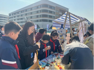 “变废为宝,创意无限” 的羽毛球编织体验区前人头攒动,成为活动现场的一大亮点。同学们、老师们甚至家长们都踊跃参与,在社团成员的耐心指导下,穿线、打结、塑形,一步步完成属于自己的创意挂件。废旧羽毛球在大家的巧手下焕发新生,这一创意不仅践行了绿色环保理念,更让艺术创作走进大众生活。
