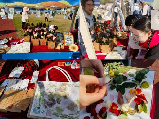 在互动体验区,社员们指导观众亲手制作干花书签与植物拓染帆布包。参与者将永生花、银杏叶等材料精心排列,封存于透明书签中;或以植物叶片为“天然印章”,通过敲拓技法将叶脉纹理印染于布料,创作出独一无二的艺术品。一位家长感叹:“孩子们用最简单的方式,把春天的颜色留在了身边,这样的活动既有意义又充满趣味。”