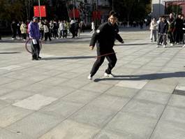 上午课间,合一广场上迎来别样风景。高二同学们将塑料圈套在身上,要在圈没有落下来的情况下跑个来回,同学们为了防止圈落下,化身为一只只“横行”的螃蟹。哨声一响,他们侧身迈步,奋力向终点奔去。