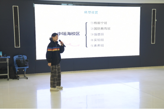 随后,专题讲座如期举行。高二(41)班王子豪和高二(44)班王欣妍以杨振宁班和强基班培养模式为核心,详细解读了班级“重基础、强创新、育拔尖”的培养理念、特色课程体系与丰硕育人成果,系统展现了合肥一中在拔尖人才培养方面的探索与实践。精彩的讲座让同学们对优质高中的培养模式有了清晰认知,更激发了大家奋发向上、追求卓越的决心与动力。
