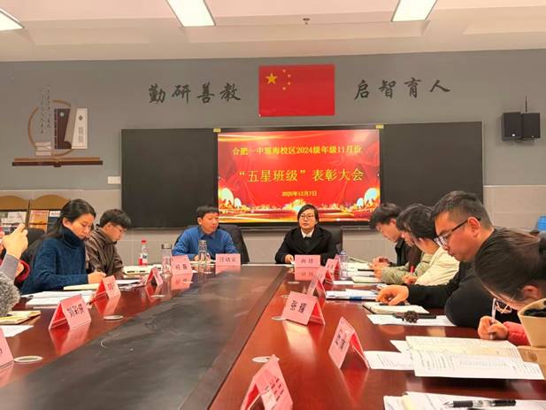 2025年12月7日晚,合肥一中瑶海校区高二年级部举行了11月份五星班级表彰暨2025-2026学年第一学期期中综合评价优秀班集体颁奖大会。合肥一中副校长肖琼、年级部主任汪结义、副主任赵燕,以及高二年级全体班主任出席本次活动,共同见证荣耀时刻。