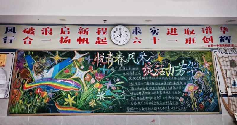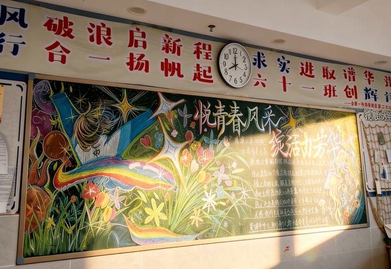 走进高二(61)班班教室,黑板上那幅色彩斑斓的作品便映入眼帘:灵动的彩虹线条勾勒出青春的跃动,繁茂的花草与闪耀的星芒铺满版面,“悦青春风采,绽活力芳华”的主题字样在笔墨间熠熠生辉。文字板块里,同学们写下独属于少年的心声——“世同青春色,共绽活力光”,是与同窗共赴成长的共鸣;“凌空之鸟有振翅的勇敢,游江之鱼有逆浪的倔强”,是对追梦路上无畏姿态的描摹;“生命选择满心向往,草木荣枯行而在此”,则藏着少年对时光与成长的温柔思考,每一行文字都让黑板报里的青春更添温度。