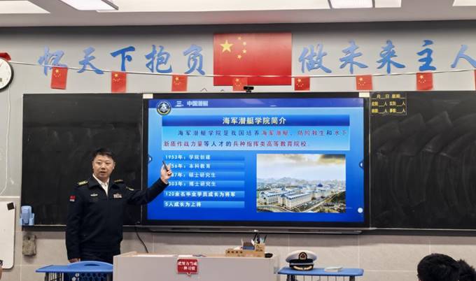 此次授课,教官以图文并茂的方式,揭开了“水下先锋”的面纱。他讲述了潜艇兵刻苦训练、默默坚守的非凡意志,展示了尖端装备与科技力量的迅猛发展,分享了历代官兵为捍卫海疆安宁而砺剑深蓝的感人故事。一幅幅惊心动魄又感人至深的画面,让同学们屏息凝神,心潮澎湃,深刻体会到“国之重器——海军潜艇”所承载的重任与荣耀。
