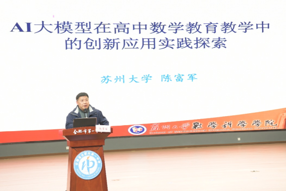 随后,陈富军副教授作“AI大模型在高中数学教育教学中的创新应用实践探索” 主题报告。他从AI大模型发展原理切入,深入分析了AI赋能数学教育的难点与突破路径,结合丰富案例解读了数学教育中AI大模型的应用场景。报告既有理论高度,又具实践指导意义,为在场教师明晰了AI技术与学科教学融合的关键节点。