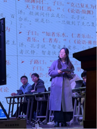 活动现场,合肥一中优秀青年教师江文达以《子路、曾皙、冉有、公西华侍坐》为教学蓝本,以“礼乐相和,心驰舞雩”为主题,带来了一堂AI赋能的经典文言文公开课。课堂上,江老师巧用智慧平板、AI语义分析工具等数字化设备,将文本解读与智能技术深度融合:利用AI为学生生成专题分析内容,精准拆解曾皙之志“浴乎沂,风乎舞雩,咏而归”中“礼”的具体体现,从沂水洗濯的古礼寓意、舞雩祈雨的礼仪内涵,到咏歌而归的礼乐教化,让学生清晰把握儒家“礼”与“乐”相融的精神内核;同时借助AI学情分析系统实时捕捉学生对“礼乐”内涵的理解难点,动态调整教学引导策略。这种“经典文本+智能技术”的教学模式,打破了传统文言文教学的时空局限,让学生在互动体验中体悟儒家思想的人文底蕴,也为文言文教学的创新实践提供了鲜活范例。