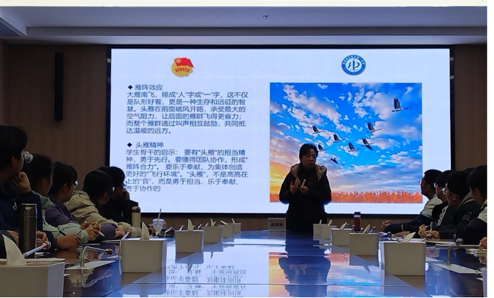 吴校长在培训中强调,学生骨干应具备“头雁精神”,勇于先行、乐于奉献、善于协作。她以“雁阵效应”作比喻,指出头雁在团队中承担破风开路的责任,为后续雁群创造更省力的飞行环境,体现了担当与协作的重要性。学生骨干不仅要有出色的个人能力,更应具备服务集体、引领团队的政治素质和领导能力。