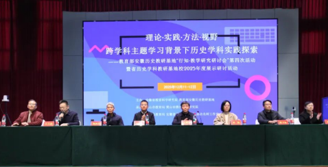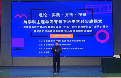 为构筑学术交流平台、凝聚历史教研力量、促进历史学科建设,2025年12月11日至12日,教育部安徽省历史教研基地“行知·教学研究研讨会第四次活动暨省历史学科教研基地校2025年度展示研讨活动”在安徽省休宁海阳中学顺利举办。本次活动聚焦“跨学科主题学习背景下历史学科实践探索”,作为安徽省首批历史学科教研基地校,我校历史组在学科主任张同侠带领下积极准备,并派钟春田、周金壬、徐淼三位教师参会,钟春田代表历史组在会上作《跨学科视域下高中历史学科实践路径探究》的主题分享。