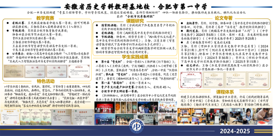 在基地校成果展示区,我校历史学科组精心筹备的成果宣传展板成为现场焦点。展板以图文并茂的形式,全面呈现了近年来学校在历史课程开发、实践育人模式创新、教师专业发展等方面的突出成效。我校历史学科组凭借扎实的实践积累、鲜明的特色亮点以及系统的育人体系,赢得了与会专家与同行的高度赞誉,充分彰显了我校在历史学科教研领域的深厚积淀。