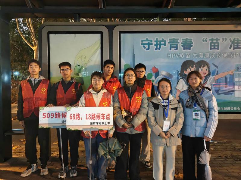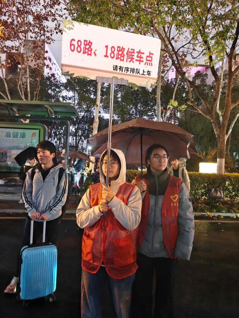 冬天的白昼十分短暂,天色渐渐昏暗,公交车散发的灯光照在志愿者们的红马甲上,十分耀眼。人潮渐渐缩小,大家纷纷登上车,用友善而感激的目光望向窗外忙碌的志愿者们。志愿者们挺直腰杆,尽力维持到最后一刻。天完全黑了,志愿者们才放好志愿牌,踏上了回家的路。尽管嗓子略哑,手臂酸胀,但内心却温暖如火。