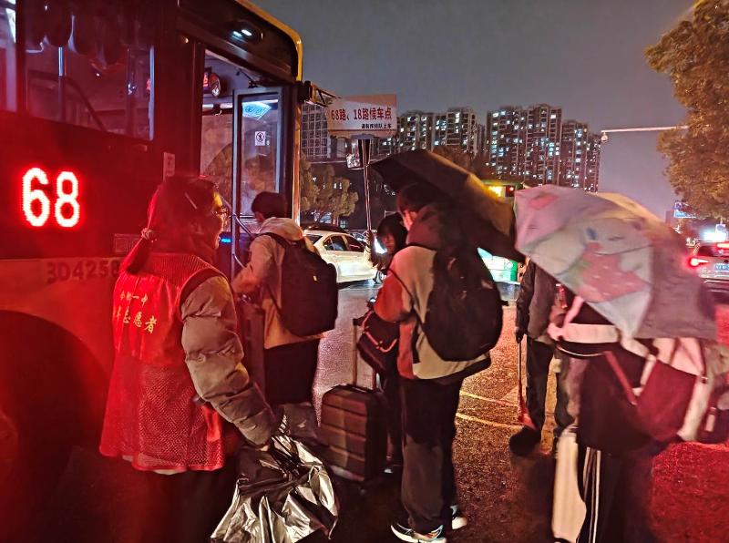 由于学校学生、教职工数量庞大,再加上家长前来接送学生,这些无疑为交通运输的压力骤增。在汹涌的人潮间,同学家长们乘车回家便成了一个难题,拥挤的站台,湿滑的地面,暗藏着危险。志愿者们风雨无阻,手中持着维交牌,打着雨伞,维持着交通秩序。“大家不要着急,请有序上车!”“大家排成一堆,安安全全地登车!注意地面湿滑,不要摔倒!”红马甲们穿梭于人群,高声呼喊着。不一会儿,错杂的人潮便有序、整齐起来。人们一个一个地登车,井然有序,志愿者们看见配合的市民,内心有上一股股暖流,声音也更加响亮,动作也更加有力。