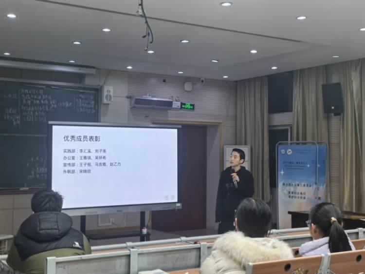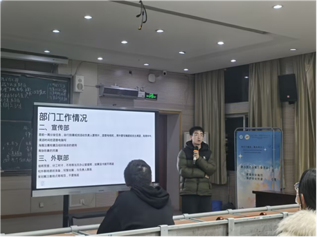 阶梯教室内温暖如春,如隔外室之凛冽。主席团与各部部长按序就坐,部员们正襟危坐,认真倾听会长杨碧涛同学的总结发言,一页一页排列整齐的PPT倾尽了会长的心血。管理层们认真注视自己部门的待改进方面。部员们也聚精会神地倾听会长的一词一句,积极改进自己存在的工作问题。