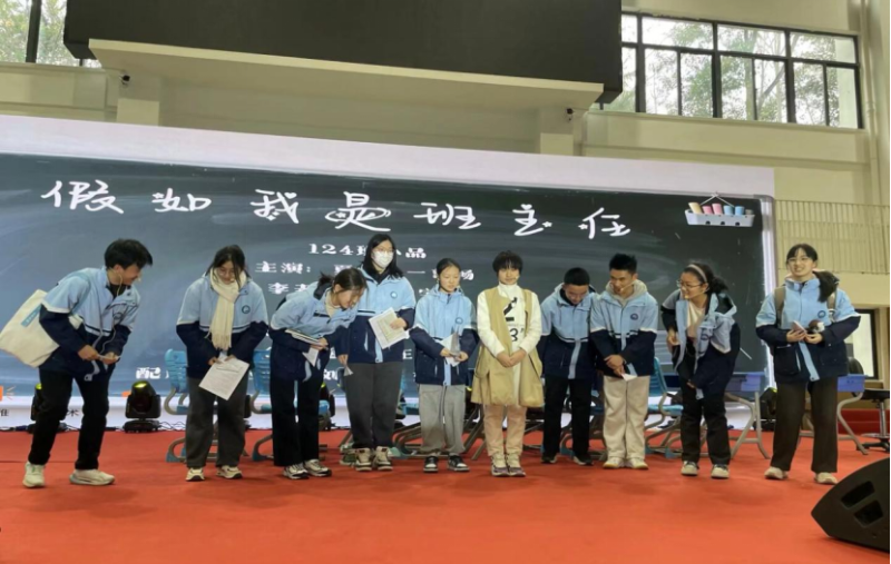 第二篇章“此间风华”聚焦校园日常与师生情谊。127班乐队表演《找自己》唱响青春探索之心,129班的《兰亭序》演绎古典风雅,青年教师合唱《长一会更好》传递对学校未来的诚挚祝愿,124班创作演出的小品《假如我是班主任》,通过角色互换的喜剧形式,幽默而深刻地探讨了师生关系、教育方法等话题,在令人捧腹的剧情中折射出理解与沟通的重要性。