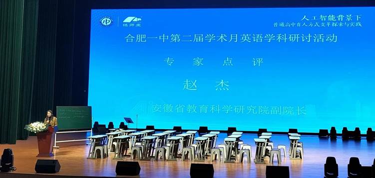 研讨环节中,安徽省教育科学研究院英语教研员杨银银老师对展示课例给予了专业点评。她指出,人工智能与英语教学的深度融合正在推动教学方式的系统性变革,从单纯的知识传授转向能力与素养的综合培养。她还特别强调,陶老师的课程展现了AI在个性化学习路径设计中的价值,而吴老师的课例则体现了技术赋能下学科融合的多元可能,这两堂课共同呈现了智能时代英语教学的发展方向。副院长赵杰在点评中强调,教育创新必须坚持育人导向,让智能技术真正服务于学生核心素养的全面提升。她进一步指出,人工智能在教育中的应用不应停留在工具层面,而应深入教学理念与评价体系的革新,真正实现因材施教与全人发展。赵院长对两节展示课体现出的“技术”与“人文”双重关怀给予充分肯定,认为这是未来教育发展的正确路径。
