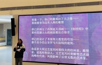 高二(91)班冯庭熠作《米开朗基罗》主题演讲。她带领我们回到文艺复兴时的意大利,以米开朗基罗的艺术人生为脉络,叩问“勇气”与“自我”。米开朗基罗24岁创作《哀悼基督》时,打破传统的取悦委托人的做法、将哲学思考注入大理石;48岁时创作《囚》系列,保留原始凿痕的“半成品”创作,承载真实情感与自我表达。米开朗基罗的“勇气”启发了罗丹等后世艺术家。那么,何来勇气?演讲点出,米开朗基罗的勇气源于热爱——是掌握规则后创造新规则,是精通技艺后超越技艺,是了解市场喜好后忠于内心的选择。演讲最终将大师精神与当下标准化的成长环境对照,结尾以意大利卡拉拉采石场照片做背景的追问:“你呢?”让艺术家的自我坚守照进高中生的成长选择,每一个人都是一块待雕刻的大理石。