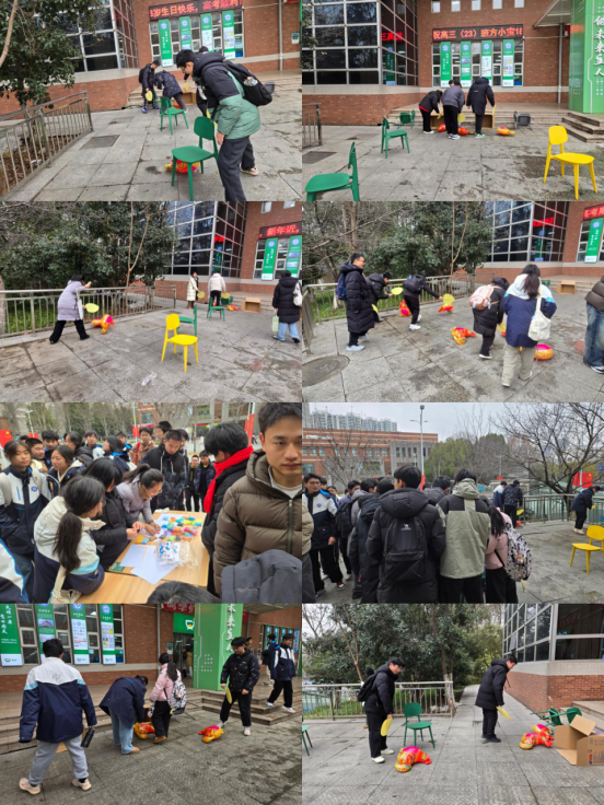 老师们和同学们此刻化身“赶鸡能手”,或屏息凝神、巧施腕力,或略显笨拙、引得笑声阵阵。五彩的充气“小鸡”在扇风的推动下,时而听话前行,时而调皮打转,场面充满了不可预知的乐趣。“赶鸡入笼”看似简单,实则蕴含丰富的心理学原理。活动中需要专注、耐心和策略,而用扇子引导充气小鸡的过程,恰恰模拟了人们在压力状态下如何调整心态、稳步前进的心理过程,这正是本次活动希望通过趣味方式传递给老师和同学的减压技巧。