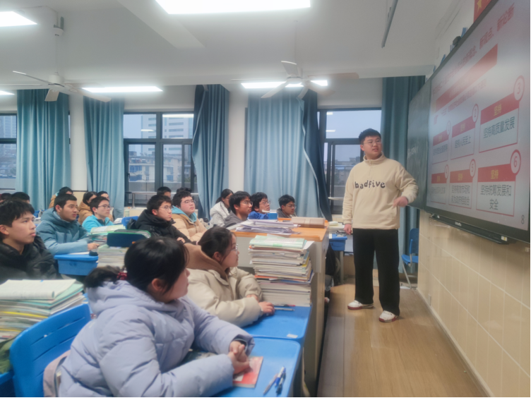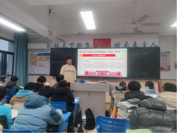 随后,宣讲重点聚焦于展望即将开启的“十五五”时期。班长刘宇航同学以同龄人的视角,探讨了在新发展阶段、新发展理念指引下国家可能聚焦的战略方向,并结合合肥作为科创名城的定位,鼓励同学们关注前沿科技、培养创新思维。他呼吁全体同学珍惜高中时光,扎实学习,锻炼能力,将当下的学业与国家未来的发展需求结合起来,思考个人成长路径。