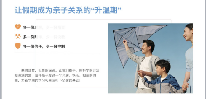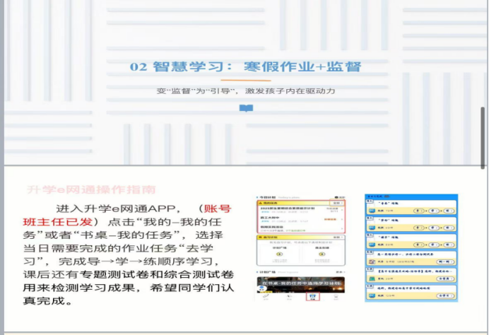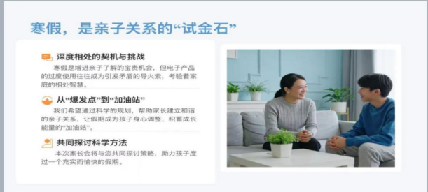 智慧学习是核心。会议重点介绍了“升学e网通”平台支持下的寒假学习流程,涵盖作业发布、AI+教师批改、错题反馈与视频订正的全链条管理。郑老师特别说明,学生个性化的学业安排经沟通后可替代部分统一作业,体现了因材施教、人文关怀的原则。他强调,家长应通过“描述性表扬”、创造无干扰学习环境、高质量陪伴等方式,激发孩子“我要学”的内驱力。