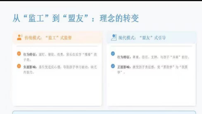 本次家长会突破传统模式,聚焦于假期中最为关键的亲子关系调适与学习内驱力激发。郑老师指出,寒假是亲子深度相处的“试金石”,也可能是矛盾爆发的“导火索”,但通过科学引导,完全能将其转变为孩子蓄力前行的“加油站”。为此,家长的角色亟待从步步紧盯的“监工”,转变为尊重信任、并肩前行的“盟友”。