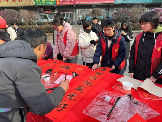 活动还未开始,现场已人头攒动,新年氛围热烈。志愿者们按照居委会工作人员的安排,做着各项准备工作。志愿者进行了现场秩序维护,将书写春联需要的桌子搬至社区广场摆放好、将笔墨纸砚整齐放置桌上,组织参加活动的居民朋友们就位。