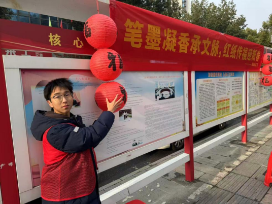 2026年2月10日,时值新春佳节到来,为弘扬和传承中华优秀传统文化,增进邻里情谊,桃花社区开展了“笔墨凝香承文脉,红纸传福迎新春”为社区居民迎新春送春联,贴福字挂灯笼等活动。合肥一中首届物理博雅高二(75)班赵子一等同学作为志愿者第一时间积极响应了居委会的活动。