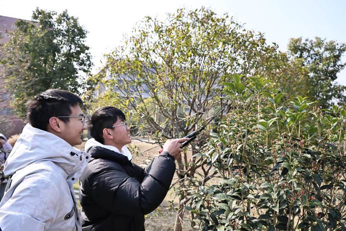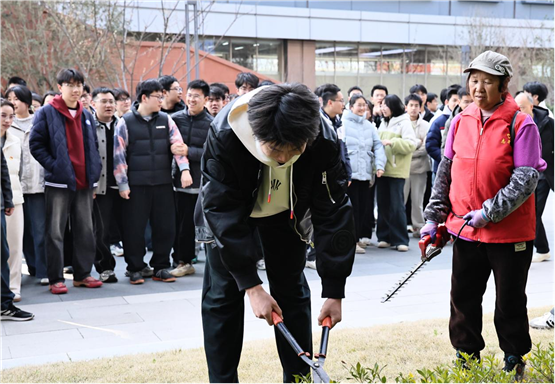 在科创中心银杏林,工作人员为大家讲解了树盘整理和除草的科学方法,详细介绍了开树盘需遵循“直径适中、深浅适度”的原则——既能防止土壤板结,又能避免损伤树木根系;除草则需彻底,以减少养分消耗。在学方楼内庭,养护工人演示了小苗修剪技巧,讲解疏剪过密枝、短截徒长枝的要领。同学们认真聆听,主动上前体验操作,在指导下学习养护诀窍,动作虽略显生疏,却饱含认真与热忱,在亲身实践中体会劳动的乐趣与价值。