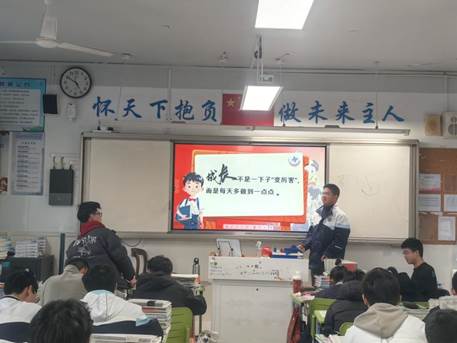班会伊始,主持人曹书博向同学们抛出“何为长大”的提问,伴随着热烈的掌,主持人巧妙借用马年的美好寓意,从“定向”入手,引导同学们思考新学期要“去哪里”。他强调:“会学不是写很多作业,而是知道怎么学习更有效。”通过生动的讲解,同学们认识到:优秀不是天生的,是习惯养出来的;成长不是嘴上说的,是行动做出来的。王京凡、闫汝成同学现场分享了自己的新学期目标,表达了将“我要好好学习”拆解为“每天多挤出15分钟”的具体行动决心。