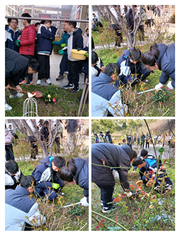 坑洼就绪,栽花正当时。张挚宇、周睿洋等同学小心翼翼地捧着带着各色花骨朵的月季花苗,轻手轻脚将花苗根部理顺放入土坑,培土压实、提苗舒展,动作轻柔又细致。杨焕然同学蹲在花旁,一点点为花苗添土固根,周弘毅则拎着水壶,为幼苗缓缓浇下水珠,让甘泉滋润每一寸根系。另一边,许梦琪、凌健辉、周仲霖、郝乐天同学主动承担起除草、捡干树叶的工作,为花苗打造干净整洁的生长环境;黄瑾源同学举着相机穿梭在人群中,定格下同学们挥汗劳作、互帮互助的温暖瞬间;石天琪、高子珺同学将精致的祈愿牌轻轻挂在花苗枝头,让美好期许与幼苗一同生长。