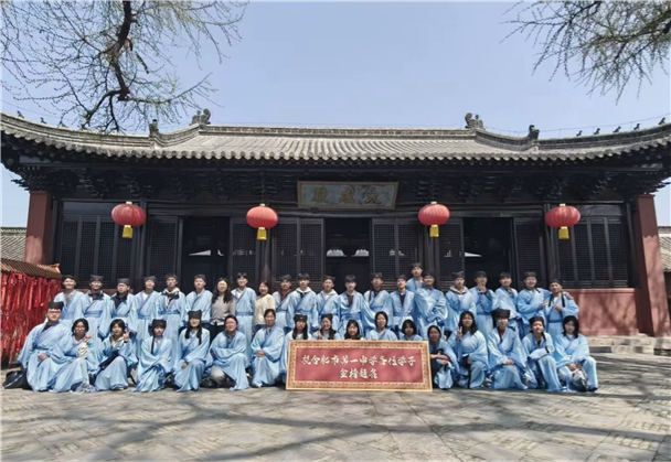 随后,我们一同走进寿县孔庙。庭院静谧,古柏苍劲,殿宇庄重,处处洋溢着崇文重教、尊师尚礼的氛围。同学们换上传统学子服饰,衣冠整齐、列队肃立,在老师的带领下向孔子像行礼祭拜。庄重的仪式让我们沉浸式感受尊师重道、崇礼尚学的传统文化,也更加理解“立德修身、勤学笃行”的深刻内涵。