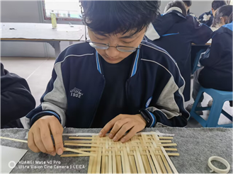 山水藏灵秀,文韵润芳华。研学旅途,自然雅趣与人文匠心交相辉映。走进仙人冲画家村,青砖黛瓦错落有致,笔墨丹青飘香满园。山野风物入画卷,匠心笔墨绘山河,同学们驻足品鉴书画佳作,沉浸感受乡土烟火与艺术美学的交融碰撞,陶冶审美情操,涵养文雅气质;更有特色竹编体验环节,同学们围坐于庭院之中,接过当地手艺人递来的纤细竹丝与素白扇面,在师傅的耐心指导下,学着穿、压、绕、编,指尖轻捻竹丝,细细梳理纹路,时而凝神思索编法,时而轻声请教同伴,原本生硬的竹丝,在一双双稚嫩却认真的手中,渐渐缠绕成错落有致的花纹,与身旁的书画佳作相映成趣。每一道编织的痕迹,都是匠心的传承,每一次指尖的起落,都是与传统文化的亲密对话,亲手编织的竹扇,既有竹的清隽,又有手作的温度,成为同学们此次画家村之行最珍贵的纪念。