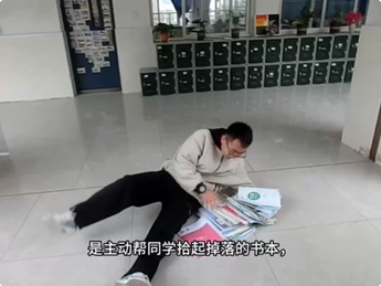 为了还原最真实的校园场景,让微电影更具代入感,拍摄团队在校园内多个地点进行取景,教室、合一广场、教学楼走廊、自行车摆放处等熟悉的场景,都成为了镜头下的“舞台”。拍摄过程中,班级十几名同学主动报名出镜,虽然没有专业的表演经验,但大家都以最饱满的热情投入其中,认真揣摩角色、反复练习动作,力求将每一个细节都演绎到位。有的同学主动承担场务工作,帮忙搬运拍摄道具、调整拍摄角度;有的同学利用课余时间配合拍摄,牺牲休息时间完成镜头录制;吴浩轩同学则全程统筹协调,从场景布置、演员调度到拍摄节奏把控,每一个环节都亲力亲为,确保拍摄工作高效推进。班主任陈露老师也全程陪伴指导,及时解决拍摄过程中遇到的问题,为同学们提供专业建议,助力微电影顺利完成。