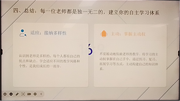 班会最后,主持人总结提出“建立你的自主学习体系”的理念。面对风格各异的老师,学生应做到“适应多样性、掌握主动权”,通过明确目标、多元学习、定期复盘、寻求反馈等方式构建属于自己的学习路径。班会以“把注意力放在自身成长上,教学相长,理解老师,你会发现自己变得更强大”作为结语,激励学生以积极心态面对新学期挑战。