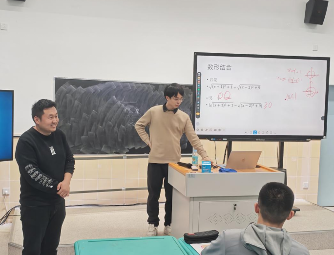 赖明辉:从数与形中探索数学之美,春光融融,李亚飞至;数竞教室,数形联合。圆与三角,藏不等式链之奥妙;点之间距,有根式函数之极值。解析几何,笛卡尔始,线性规划,可行域寻。空间几何,微妙玄通。以数之名,来剖其形;以形之美,来解数迷。人云:“数缺形时少直观,形缺数时难入微。”岂虚言哉!数AI爱合一,数形结合,道阻且长,行稳至远。亚飞慧敏,其言深刻。思维碰撞,五脉皆通。幸甚至哉,歌以咏志!
