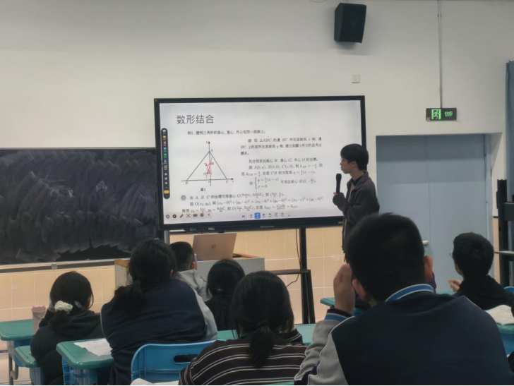 紧接着,他以一道经典几何证明题为例,演示了解析几何的便捷解法:无需繁琐推导,建立直角坐标系即可快速求解。无需刻意说教,数形结合 “化繁为简” 的魔力便跃然纸上。