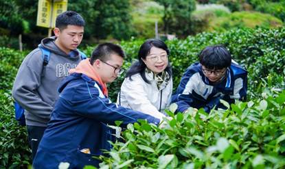 一个多小时的车程后,我们来到了采茶基地。在这里,同学们既在讲解员的讲述下,了解了“徽茶”历史,又亲自走进茶田,体验了采茶生活。指尖掠过初芽,一点新绿便落入掌心。新鲜的茶叶就这样在腰间箩筐中一点点堆集,裤脚的淤泥,额间的汗水,满身的疲惫:这一切的烦恼,都被那缕馥郁的馨香冲刷而去。