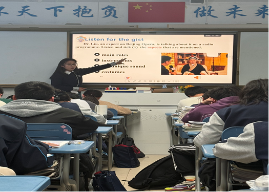 课堂上,学生们一改往日的拘谨,听得专注、互动积极。不少同学在课后表示:“原来用英语介绍京剧这么有意思,既练了听力和单词,又了解了咱们自己的传统文化,感觉特别酷!” 还有同学说,第一次知道京剧的行当有这么多讲究,想课后再多看看京剧表演,把课上学到的英语介绍内容补充完整。